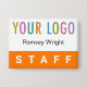 Easily personalise our rectangle pin back button badge with recipient name or other custom text. It attaches with a safety pin back. Sold in orange and other colours (all colours are customisable). Our rectangle buttons are 3.5 inch x 2.5 inch. Made in USA. No minimum order quantity and no setup fee.