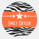 Trendy and modern Stars Zebra Print Sweet Sixteen Stickers featuring a chic black and white zebra print background and a bold orange border adorned with a fun star motif. These girly stickers are a hip and stylish choice for a fun sweet 16. Easy to customise, simply add party details in the text fields provided. Click "Customise It" to find more personalisation options.