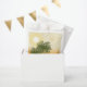 Send guests home in tropical style with vibrant favor bags designed by Destei. Two green palm tree silhouettes stand against a glowing orange-to-yellow sunset sky, with three birds flying in the sky. Personalize the text to add a special 'Thank You' message for your celebration.