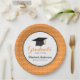 This graduation paper (disposable) plate features a graphic of a graduation hat (mortarboard) and custom text for: Class of, Graduates Name, Name of School. This paper plate is accented with a white swirl pattern on an orange background.