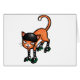 A blank greetings card featuring an cartoon orange tabby wearing 2 pairs of roller-skates, black and white stripey socks and a safety helmet.