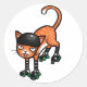 Featuring an cartoon orange tabby wearing 2 pairs of roller-skates, black and white stripey socks and a safety helmet.