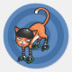 Featuring an cartoon orange tabby wearing 2 pairs of roller-skates, black and white stripey socks and a safety helmet on a blue circle target background.