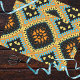 Seamless decorative pattern featuring geometric shapes in orange, yellow, turquoise and black.