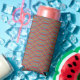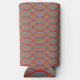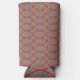 This seltzer can cooler has a Boho design of orange and red waves on a field of grey.