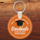 This modern orange and white custom senior graduate keychain features your high school or college name for the class of 2026. Customize with your graduating year under the chic handwritten script and black grad cap for a great personalized graduation key chain gift.