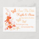 This nautical beach theme inspired wedding save the date post card has bright orange hibiscus type tropical flowers and decorative scrolls on it, along with sand beige butterflies, starfish, a scalloped shell and a seahorse to complete the look. It would be perfect for a destination wedding, a beach wedding, or for anyone getting married in the tropics. It matches the wedding invitation shown below. ****If you change fonts, or the size of the font, some of the design and/or text may get cut-off. Everything will print as you see it on your monitor. I will not see changes you make, and Zazzle will NOT correct anything (typos, mis-alignment etc.). The text is all customisable. If you need help with this product, please email me BEFORE you place your order. If you require any other matching items, please email your request to niteowlstudio@gmail.com.