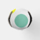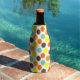 This bottle cooler has a geometric design of blue, orange, yellow, and brown dots.