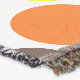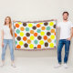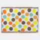 This throw blanket has a geometric design of blue, orange, yellow, and brown dots.