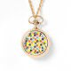 This women's watch has a geometric design of blue, orange, yellow, and brown dots.