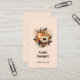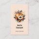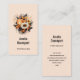 Business cards with an elegant yet goth style flower bouquet. Composed of orange tulips, yellow daisies, grey leaves and sprigs and some orange berry accents.