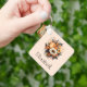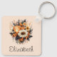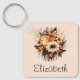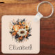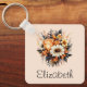 A keychain with an elegant yet goth style flower bouquet. Composed of orange tulips, yellow daisies, grey leaves and sprigs and some orange berry accents.