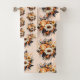 Patterned towel set with an elegant yet goth style flower bouquet. Composed of orange tulips, yellow daisies, grey leaves and sprigs and some orange berry accents.