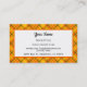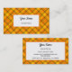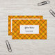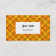 Business cards with a retro plaid pattern of yellow and orange with smaller brown and green stripes on an editable business card with script and vintage and script letters for your name and info, both front and back.