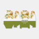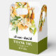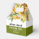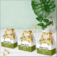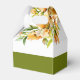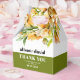 This fall wedding favor box displays a beautiful rhododendron branch adorned with delicate orange yellow flowers and greenery. The couple's names are elegantly displayed in bold typography, adding a personal touch to the design. A heartfelt 'Thank You' message is also included, expressing gratitude to the guests. Completing the look, a stylish olive green band adds a touch of sophistication at the bottom of the box.