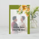 This stylish fall wedding Thank You photo card features a lovely picture of the newlyweds surrounded by an olive reen border and a rhododendron branch with orange yellow flowers, complementing the bold typography of the simple text to achieve a contemporary and chic aesthetic. Turning to the back of the card, a heartfelt 'Thank You' message awaits to express gratitude to all who shared in the special day.