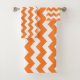 Bathroom towel set orange stripe design. This orange striped bath towel can customised with any text of your choice. Should you require any help with customising then contact us through the link on this page. Orange striped bathroom towel set that includes a bath towel, hand towel and face cloth