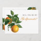 This elegant "Will you be my Godparents" proposal card has on the left, a orange tree branch with two oranges and green leaves. On the right, there is the text of the proposal; the word "Godparents" is written in an orange elegant calligraphic script, the rest in small black caps.