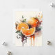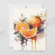 Vibrant oranges are depicted with leaves, surrounded by dynamic splatters and drips of colour. The composition combines slices and whole fruits with an abstract style, creating an energetic and fresh representation.