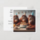 A really cool invitation picturing orangutangs sitting at a kitchen table celebrating with a birthday cake and party hats, a great invitation for orangutang lovers, ape lovers and zoo lovers.