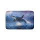 A dynamic orca leaps from the ocean with water splashing around its body, set against snow-covered mountains and a dramatic purple-blue sky—capturing the power and beauty of marine life in motion.
