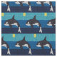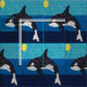 Artistic depiction of an orca whale in the ocean, illuminated by a vibrant sun in the background.