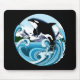 An orca jumping out of the ocean with water all around, Mountains and blue sky around the killer whale drawn in an art nouveau tattoo style.