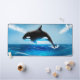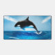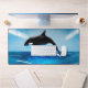This lively illustration of an orca whale is sure to bring life any one's desk or computer space! The whale, sometimes called the killer whale, is leaping out of the ocean. Water is dripping from the whale and the water shows movement as well. Blue colours are bright bring out the black and white of the orca whale.