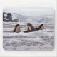 Four orcas spyhopping around a seal on an ice floe in Antarctica.