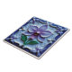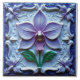 An orchid flower with white petals and green leaves, surrounded by a decorative border with floral motifs, on a square tile with a blue and white colour scheme.