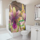 The orchids are blooming again in the garden, in the original photograph by ZoeSPEAK on this shower curtain. The flowers, emerging from a curving green stem, have purple centres which blend into yellow at the tips of the petals. The natural wood background sets off the sculptural shapes and colours.