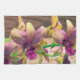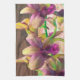 The orchids are blooming again in the garden, in the original photograph by ZoeSPEAK on this Kitchen Towel. The flowers, emerging from a curving green stem, have purple centres which blend into yellow at the tips of the petals. The natural wood background sets off the sculptural shapes and colours.