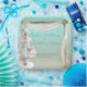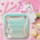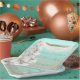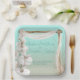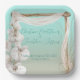 This wedding party plate has a romantic beach theme. The background features a gradient that resembles a tropical ocean beach or island. A boho arch of wood and chiffon is in the centre. A large stem of watercolor style white orchids is placed on the left.