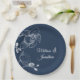Elegant and romantic wedding paper plates featuring a beautiful and delicate white orchids line drawing design on one side, over a classic Prussian Blue background. Easily edit the template fields to add the bride and groom names in a classy white script.