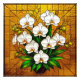 Elegant white orchids depicted in a luminous stained glass design, showcasing vibrant green leaves against a striking golden backdrop, invoking beauty and sophistication.