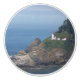Classic coastal photograph of a white lighthouse with red roof in Oregon with a calm sea.