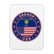 Badge of Oregon with flag of Oregon and flag of USA colors, rounded shape.