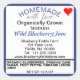 Wild Blueberry Jam is written in blueberry colour (remove Wild text if needed). Homemade with Love Organically Grown accessories for canning. Leave wording, change to Locally Grown, Preserves, or delete fields. Seedless is written in black italics (keep or remove). Insert Farmer's Market or other Name and Contact Details. Ingredients and Net Weight listed at bottom to personlize. Red heart at the top against fresh crisp white background with deeper blueberry purple border. Original Artwork and Design by TamiraZDesigns.