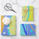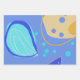 This Wrapping Paper Flat Sheet Set of 3 features three images that have flat backgrounds in general, blue on the first paper and the third one yellow on the second. Their inner forms are organic some and refer to fruits -reminiscent of lemons above all-, and abstract others. Their general colours are turquoise, yellow, blue, white and orange with many polka dots playing around.