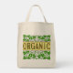 Organic a green slogan for gardeners, cooks and Earth Day celebrations, in decorated capital letters against a background of acorns and oak leaves, surrounded by scrolling leaves.
