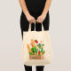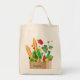 Organic tote bag with a delicious illustration of healthy vegetables flying out of a paper bag.