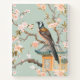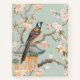 This tranquil design showcases an oriental-inspired scene with a delicate pale aquamarine blue background. A small bird, featuring shades of brown, grey, and black with striking white and black facial markings, perches on a traditional oriental-style birdhouse nestled among tree branches adorned with pale pink and white blossoms. The soft pastel tones and intricate details evoke a serene and elegant atmosphere, making this design a celebration of nature and artistry.