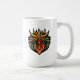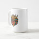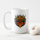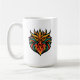 A striking oriental dragon head in red, orange, and teal tones with bold black outlines. Symbol of strength, wisdom, and power—perfectly displayed on this unique mug.