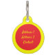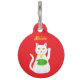 This awesome pet tag features a graphic design image of a lucky oriental white waving cat. The cat has beautiful gold eyes and is wearing a gold medallion on the collar around its neck. The cat has pink ears and whiskers. This cute little kitty is holding a golden token with green jade inlay and a message in golden text that says "Good Luck". There is custom text so you can include the name of your pet on the front and your contact details on the back.