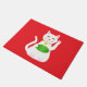 This awesome doormat features a graphic design image of a lucky oriental white waving cat. The cat has beautiful gold eyes and is wearing a gold medallion on the collar around its neck. The cat has pink ears and whiskers. This cute little kitty is holding a golden token with green jade inlay and a message in golden text that says "Good Luck".