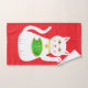 This awesome hand towel features a graphic design image of a lucky oriental white waving cat. The cat has beautiful gold eyes and is wearing a gold medallion on the collar around its neck. The cat has pink ears and whiskers. This cute little kitty is holding a golden token with green jade inlay and a message in golden text that says "Good Luck".