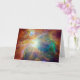 This image shows stars, dust and gas inside the Orion Nebula, 1500 light years from Earth. This is a composite photo, based on ultraviolet and visible light images from the Hubble Space Telescope, and infrared views from the Spitzer Space Telescope. The result shows a swirling mass of gas and dust in shades of orange, green, blue and purple, spotted with bright stars. (The colours have been enhanced slightly here.)