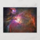 This is a photograph of the massive Orion Nebula, taken by the Hubble Space Telescope. The Orion Nebula is the birthplace of many new stars, and over 3000 stars are present in this image, surrounded by swirling clouds of gas and dust. The colours of the original photo have been enhanced slightly, and include rich oranges, pinks and purples.