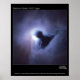 NGC 1999 is an example of a reflection nebula. Like fog around a street lamp, a reflection nebula shines only because the light from an embedded source illuminates its dust; the nebula does not emit any visible light of its own. NGC 1999 lies close to the famous Orion Nebula, about 1,500 light-years from Earth, in a region of our Milky Way galaxy where new stars are being formed actively. Its mass is estimated to be 3.5 times that of the Sun. The star is so young that it is still surrounded by a cloud of material left over from its formation, here seen as the NGC 1999 reflection nebula. The WFPC2 image of NGC 1999 shows a remarkable jet-black cloud near its centre, resembling a letter T tilted on its side, located just to the right and lower right of the bright star. This dark cloud is an example of a "Bok globule," named after the late University of Arizona astronomer Bart Bok. The globule is a cold cloud of gas, molecules, and cosmic dust, which is so dense it blocks all of the light behind it. In the Hubble image, the globule is seen silhouetted against the reflection nebula illuminated by V380 Orionis. Astronomers believe that new stars may be forming inside Bok globules, through the contraction of the dust and molecular gas under their own gravity. NGC 1999 was discovered some two centuries ago by Sir William Herschel and his sister Caroline, and was catalogued later in the 19th century as object 1999 in the New General Catalogue. Image Credit: NASA and The Hubble Heritage Team (STScI)