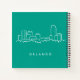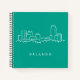 This design features a hand drawn sketch of the Orlando skyline on a turquoise background.